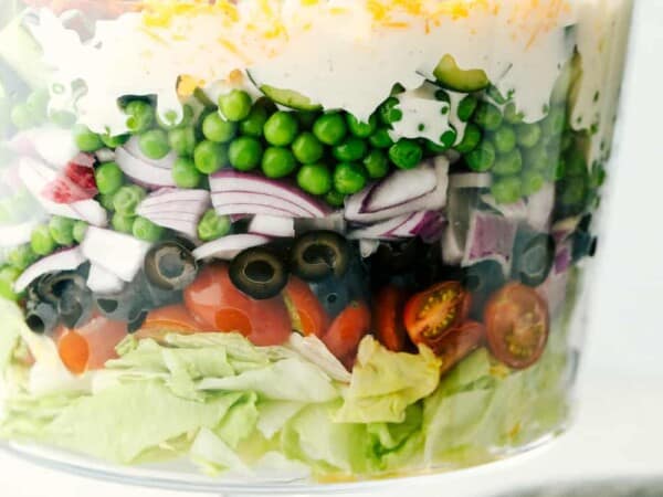 - Dressing: 7 layer salad is typically made with a mayonnaise-based dressing. Ranch dressing is a favorite because everyone loves it. You can use a simple combination of mayo, sour cream, vinegar, salt, and sugar as well.