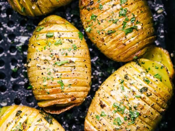With just a little extra time and effort you can turn ordinary baked potatoes into something extraordinary. Perfect for holidays and special occasions or just because, these garlic butter potatoes will be the hit of the dinner. The little cuts open up beautifully as they cook in the air fryer and the garlic butter oozes into every nook and granny. Topped with herbs and salt these potatoes are insanely delicious. Your whole family is going to love them.