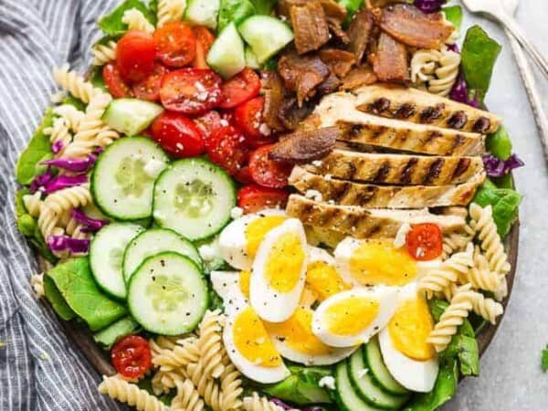 This Balsamic Chicken Cobb Salad is packed with flavor and so simple to customize. I love a good cobb salad and this one has all the classic ingredients like juicy tomatoes, lettuce, hard boiled eggs, avocado, bacon, cheese with the addition of cucumber and rotini pasta.