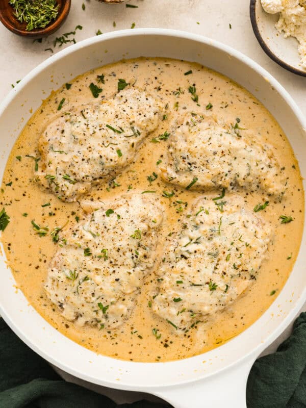 Just like with our Boursin Chicken, these Boursin Pork Chops are out of this world delicious! It’s an easy-to-make recipe with a creamy, flavorful sauce that’s definitely restaurant-quality. Simply season and sear the pork. Then, in the same pan, mix together a creamy, dreamy sauce with minced shallots, broth, heavy cream, parmesan, and Boursin cheese. Add the pork back to the pan, then serve over mashed potatoes to soak up the amazing sauce!