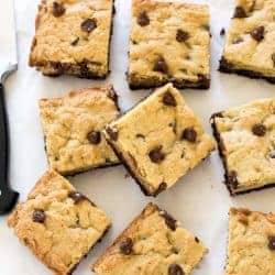 The bars are soft, moist and buttery with chocolate chips in every bite!ย These are the perfect choice when you can’t decide between a brownie and a cookie.
