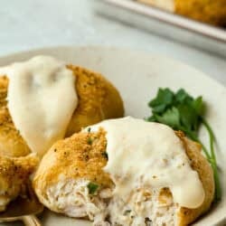 - Serve the gravy on the side or pour it over the warm chicken pillows and enjoy!