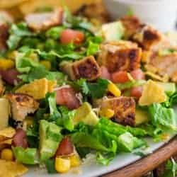 - To assemble the salad place 1 head shredded lettuce, in the bottom of a large bowl. Add the cooked chicken, 3 diced Roma tomatoes, 2 diced avocados, ยฝ cup grated pepper jack cheese, 3 sliced green onions, cooked corn, ยฝ cup cilantro leaves, and crushed tortilla chips,. Drizzle and toss with the dressing and serve.