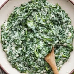 Creamed Spinach is a classic and delicious side dish! It is loaded with fresh spinach and has the creamiest garlic parmesan sauce. Serve it alongside any meal!