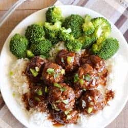 My latest version of a classic meatball are these Teriyaki Meatballs. This recipe is so so yummy. The meatballs come together super fast and while those bake, you can prepare the sauce and cook the rice (I use Minute Rice) and broccoli. In less than 30 minutes total, you can have this super delicious dinner on the table. I highly recommend using a cookie scoop for the meatballs. It is so much easier and faster than trying to roll them by hand. Although, my girls beg to help me roll the balls usually, so we have fun with that!