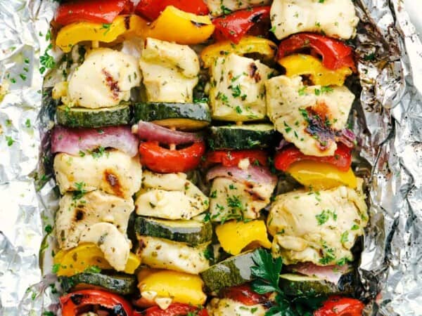 With the help of Reynolds Wrapยฎย Non-Stick Foil, the skewers are assembled and laid flat on the Reynolds Wrapยฎย non stick foil. To help keep the grill clean and free from the chicken sticking or the vegetables falling through the grates. Reynolds Wrapยฎย Non-Stick Foil will cook the chicken skewers perfectly, giving it a steamy covering while grilling it from the inside out, without any of the chicken and vegetables getting stuck to the foil. These garlic ranch chicken skewers are so tender and flavorful your family is going to be begging for more.