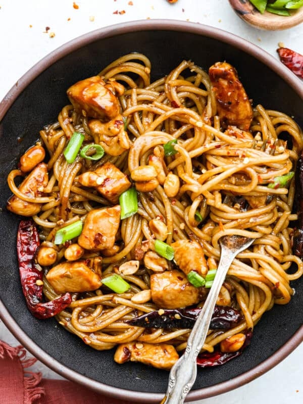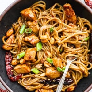 Skip the takeout, these Kung Pao Chicken Noodles are spicy, saucy, and loaded with flavor! Tender chicken, chewy noodles, crunchy peanuts, and a kick of heat all come together in one quick and easy dish thatโs perfect for weeknight dinners.