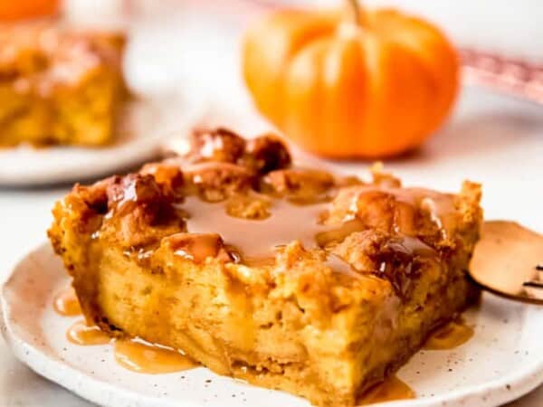 We love it both ways! It’s impossible to resist a warm slice of pumpkin bread pudding drizzled with your favorite caramel sauce and topped with a scoop of ice cream. But it’s delicious chilled as well.