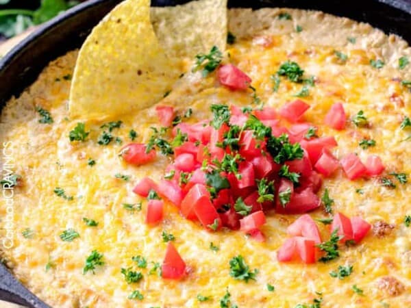 - You can transfer dip to slow cooker to keep warm for 2 hours or serve immediately. Garnish with fresh cilantro and chopped tomatoes if desired.