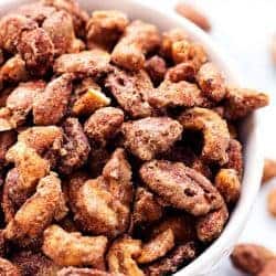 These slow-roasted cinnamon sugar candied nuts include almonds, cashews, and pecans. They are coated in a sugar glaze spiced with cinnamon, making the best snack for any occasion! They also make amazing neighbor gifts!