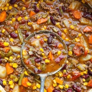 - Add the Mix-ins: Then add diced tomatoes, corn, kidney beans, green beans, beef broth, condensed tomato soup, and potatoes.