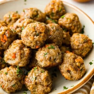 These cute little sausage balls are such a fun way to eat stuffing during the holidays. I have been asked to bring them every time we get together. Make them with all the other classic sides like mashed potatoes, sweet potatoes, and rolls!