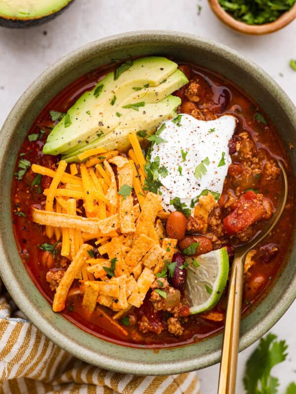 Turkey chili is such a comforting, tasty meal! Packed with ground turkey, tender vegetables, hearty beans, and a blend of bold spices, itโs filled with the most delicious flavor. Great for making ahead and feeding a crowd!